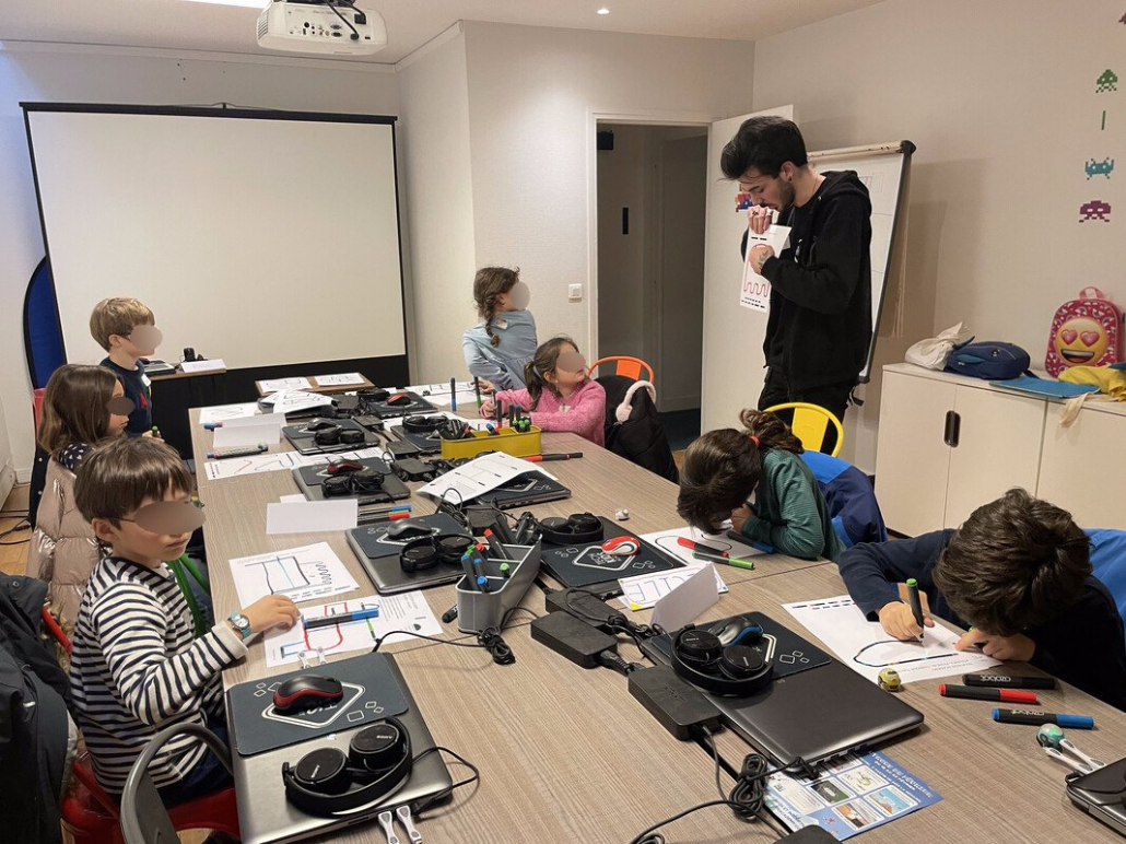 Les enfants s’initient à la robotique 🤖 avec Ozobot, le plus petit robot au monde ! Grâce à son capteur de couleurs, Ozobot peut suivre des lignes de couleurs (line-follower) et « lire » des codes pour réaliser des actions précises, comme changer de vitesse, faire demi-tour ou exécuter des mouvements spéciaux. Les enfants découvrent le fonctionnement du capteur de couleurs à travers différentes fiches d’activités. Une activité robotique sans écran qui fait l’unanimité ! À la fin de l’atelier, ils peuvent soit dessiner un gigantesque circuit pour leur robot, sur un thème défini (ou libre pour les plus créatifs), soit dessiner des formes sur l’ordinateur avec l’application Shape Tracer d’Ozobot.