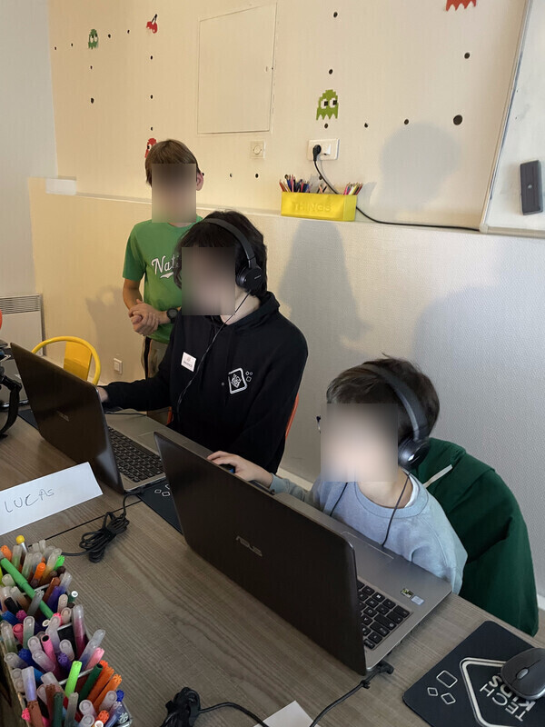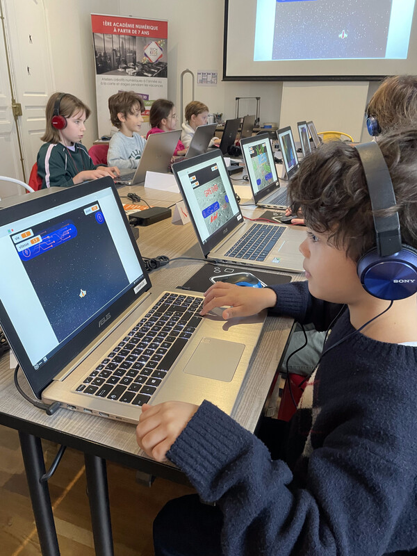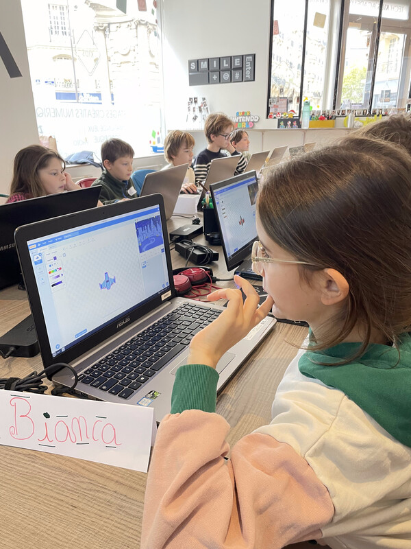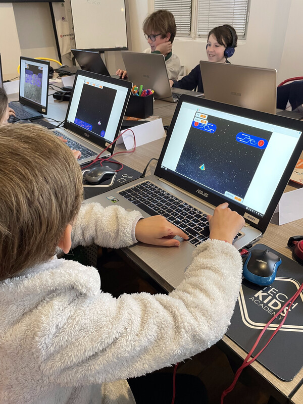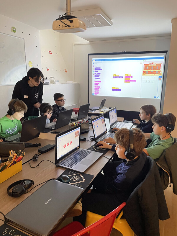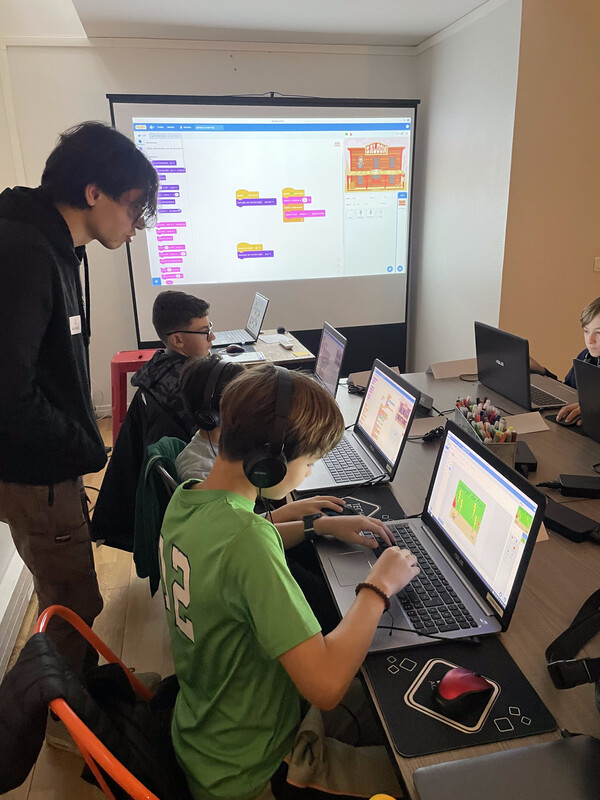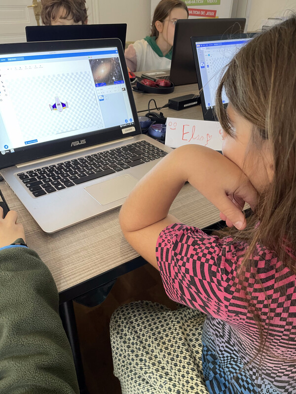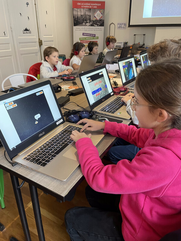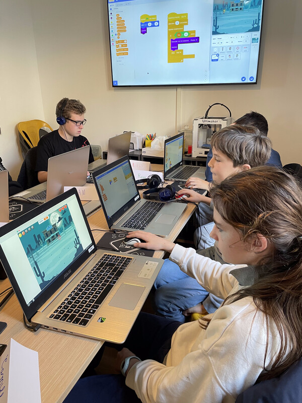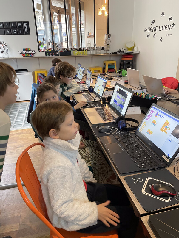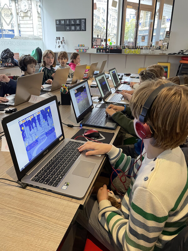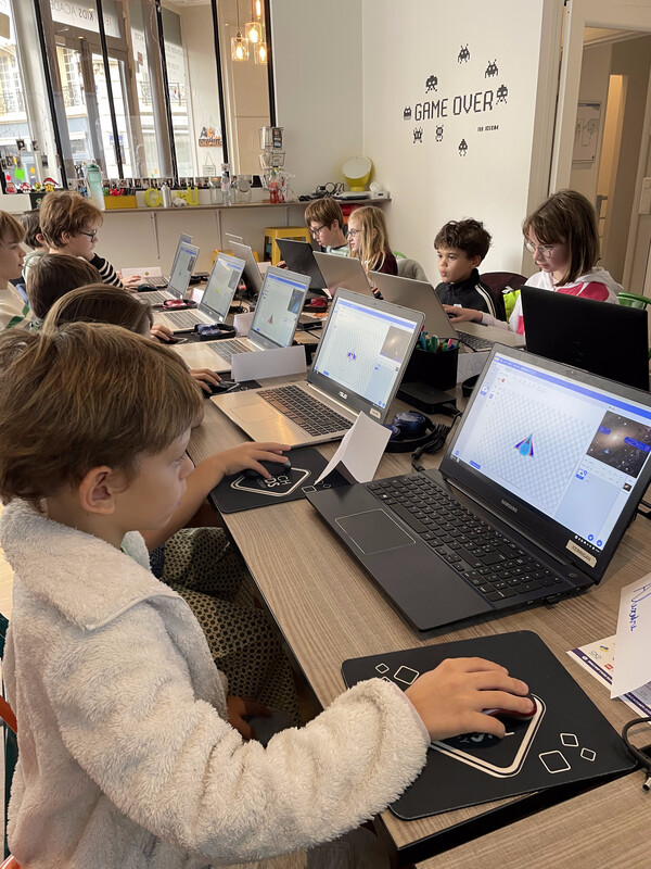 Les enfants s’initient à la programmation de jeux vidéo avec Scratch. Ils apprennent la logique algorithmique en assemblant des blocs (boucle, condition, variable, évènement n’ont plus de secret pour eux).