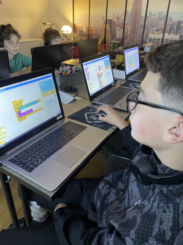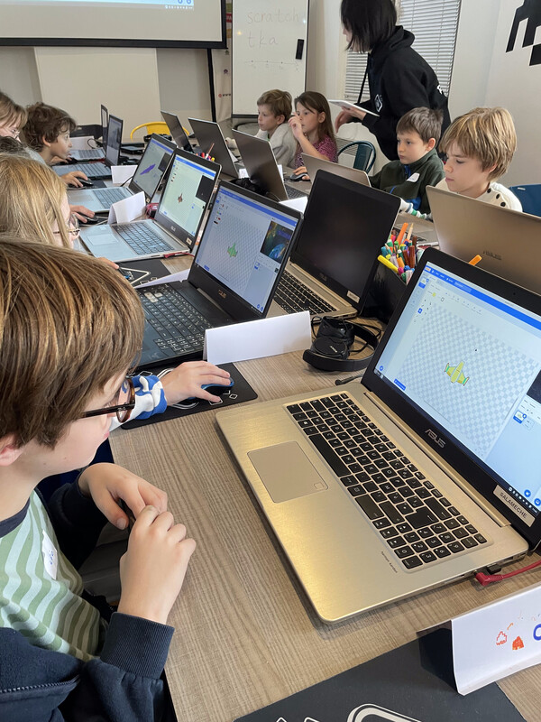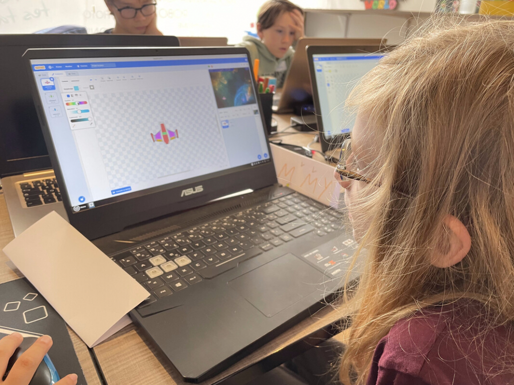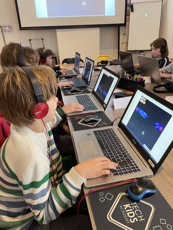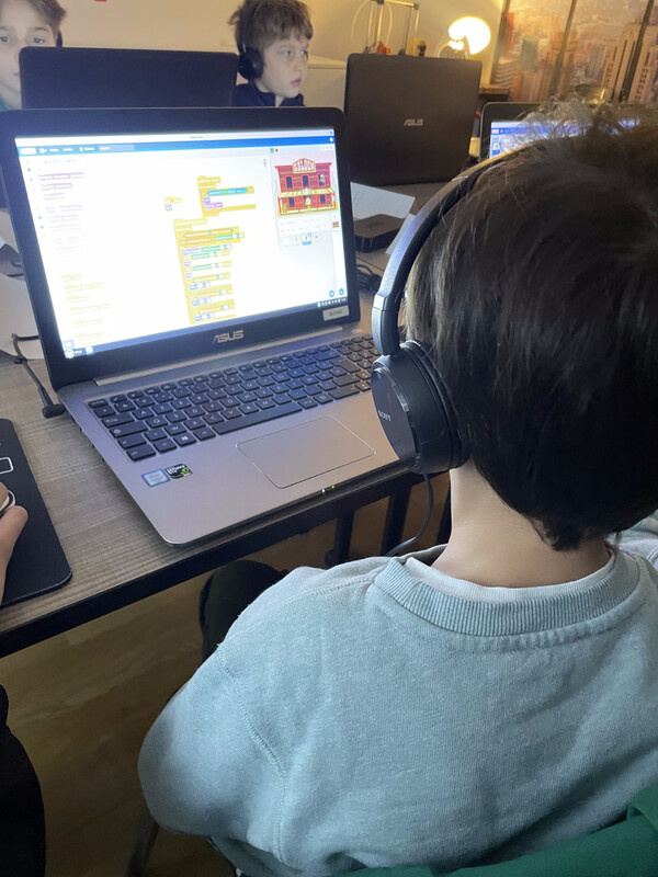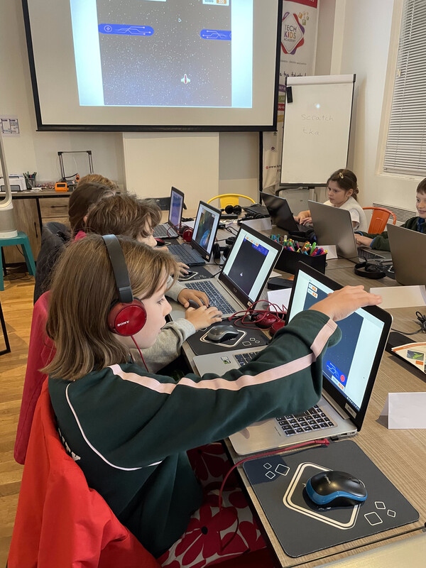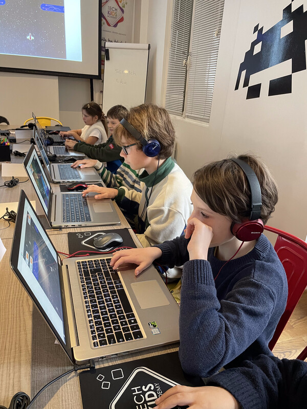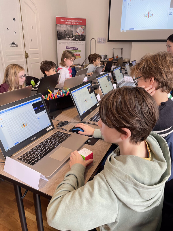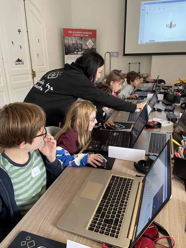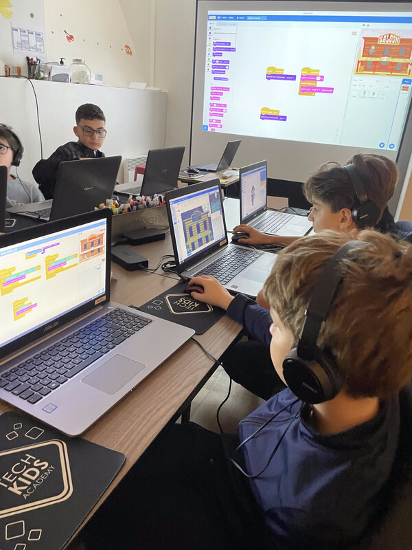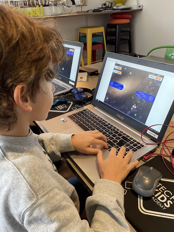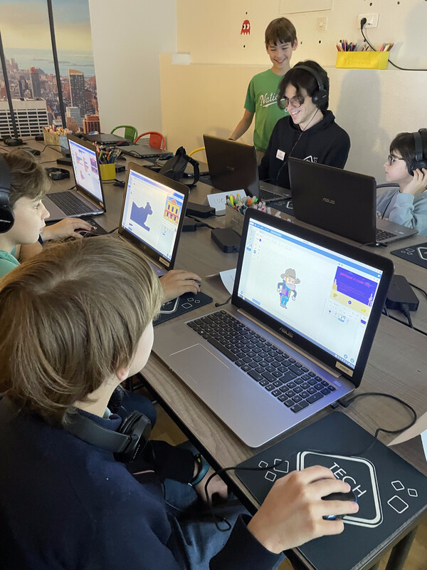 Les enfants s’initient à la programmation de jeux vidéo avec Scratch. Ils apprennent la logique algorithmique en assemblant des blocs (boucle, condition, variable, évènement n’ont plus de secret pour eux).